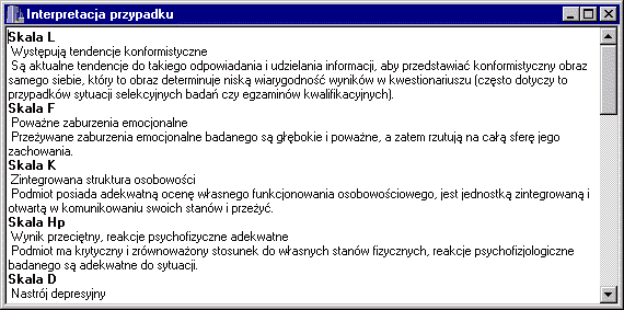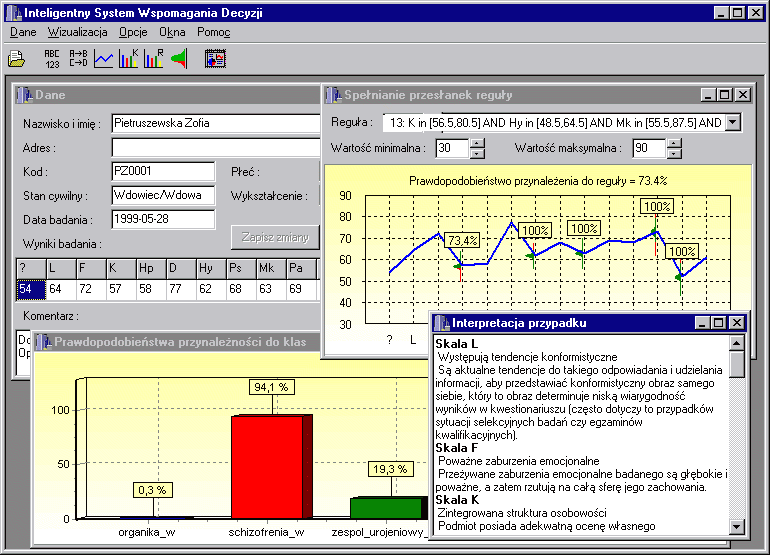 Program ma również możliwość wyświetlania werbalnej interpretacji wyników badania, a także interpretacji stosowanych reguł wnioskowania.