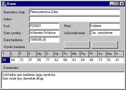 Program pozwala utrzymywać bazę danych o osobach badanych, dzięki czemu w każdej chwili można powrócić do wyników poprzednich badań pacjenta. Jedno z okienek może cały czas pokazywć nam dane pacjenta, a także pozwala na wpisanie własnego komentarza na temat aktualnie wybranego badania. Komentarz może mieć dowolną długość, więc można umieścić w bazie danych dowolnie dokładny opis badania, który będzie dostępny w każdej chwili w przyszłości, a także może być drukowany na raporcie z badania. Wszystkie okna programu przedstawione poniżej przedstawiają program w konfiguracji przystosowanej do przeprowadzania i analizy testów MMPI (Minnesota Multiphasic Personality Inventory)