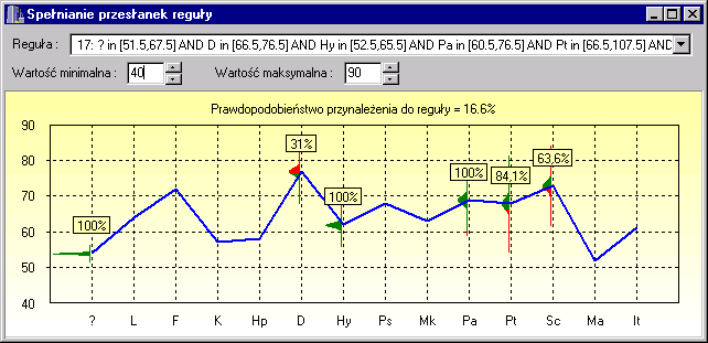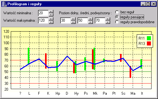 Wyniki testów są zwykle wizualizowane jako profilogramy. Jedna z opcji programu pozwala otworzyć w specjalnym okienku taki profilogram, na którym dodatkowo można umieścić kolorowe paski oznaczające przedziału pojawiające się w regułach do których profilogram pasuje, lub też które może spełniać z niezerowym prawdopodobieństwem jeśli uznamy dane za rozmyte zgodnie z rozkładem Gaussa.