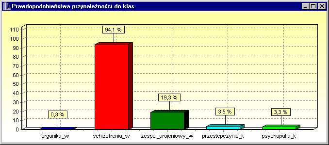 Kolejne okno może pokazywać prawdopodobieństwa przynależności do poszczególnych klas wyliczone na podstawie prawdopodobieństw spełniania reguł: