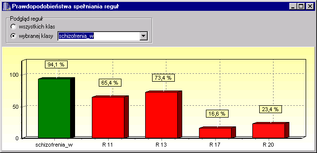 Wartości prawdopodobieństw spełniania poszcególnych reguł pokazuje nam inne okienko programu: